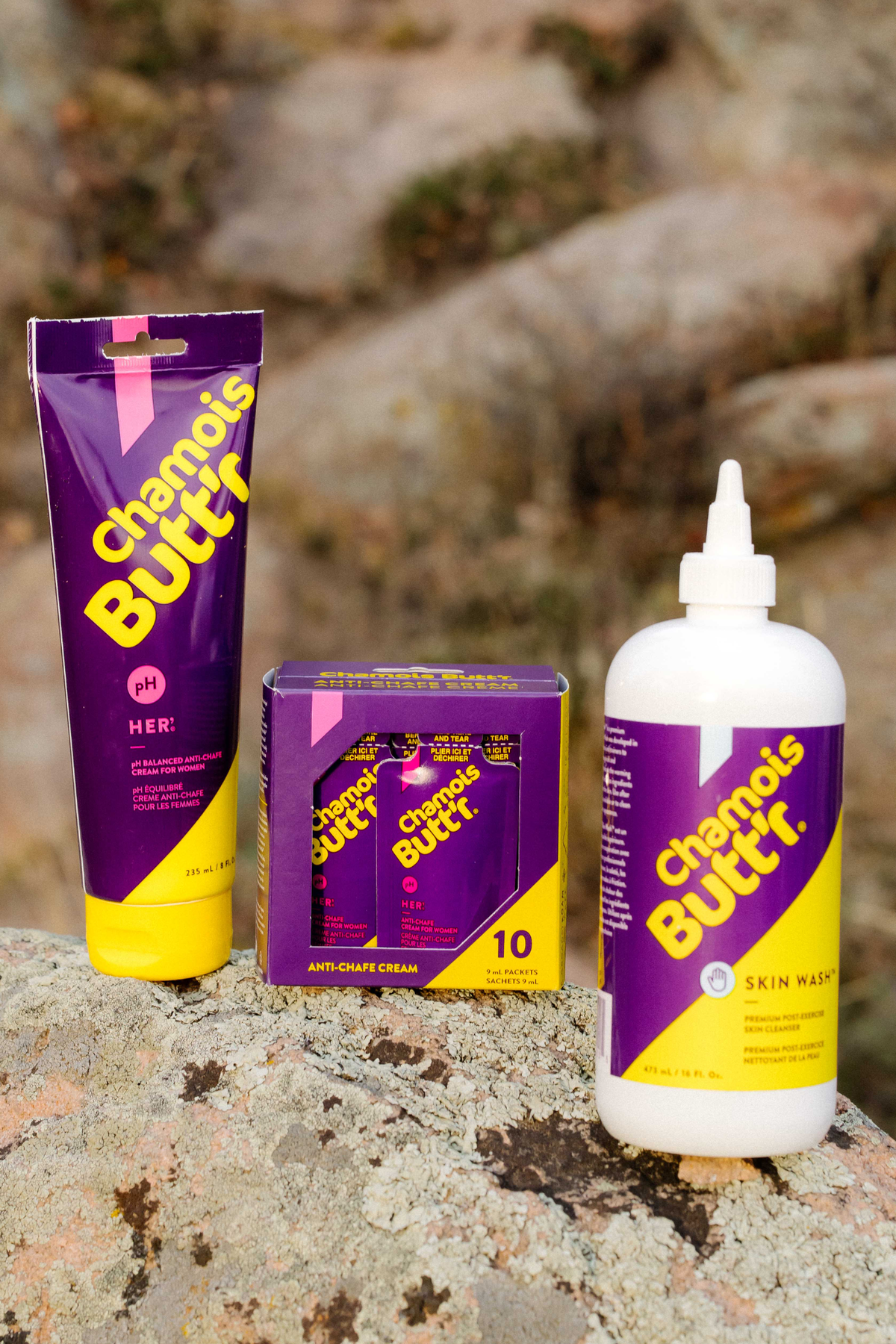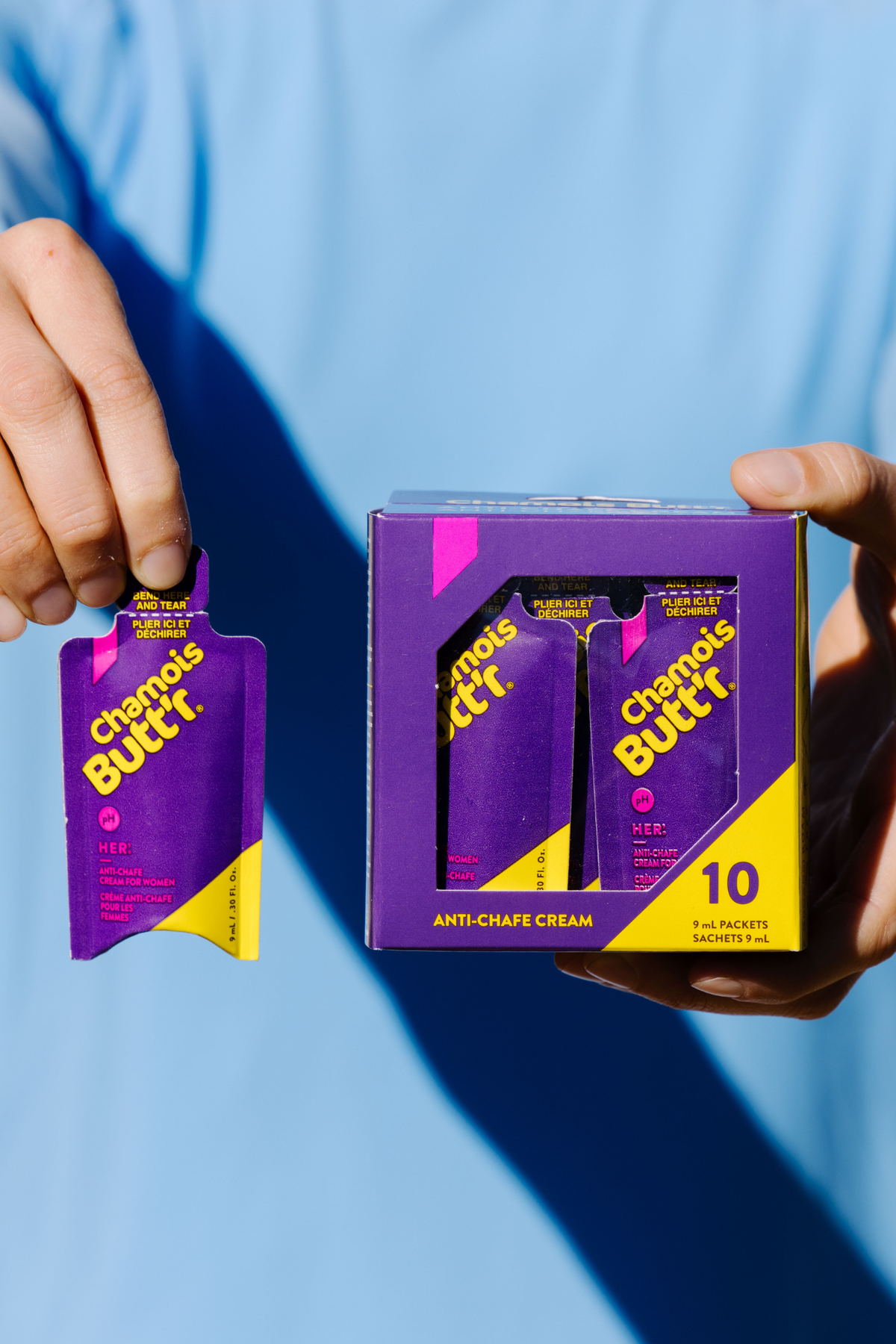 10-Pack Box of 9mL Single-Use Packets of Chamois Butt’r Her’ Anti-Chafe Cream. Your favorite cream in a take-anywhere format. Perfect for race days, travel, or keeping a few stashed in your gym bag for comfort on demand.